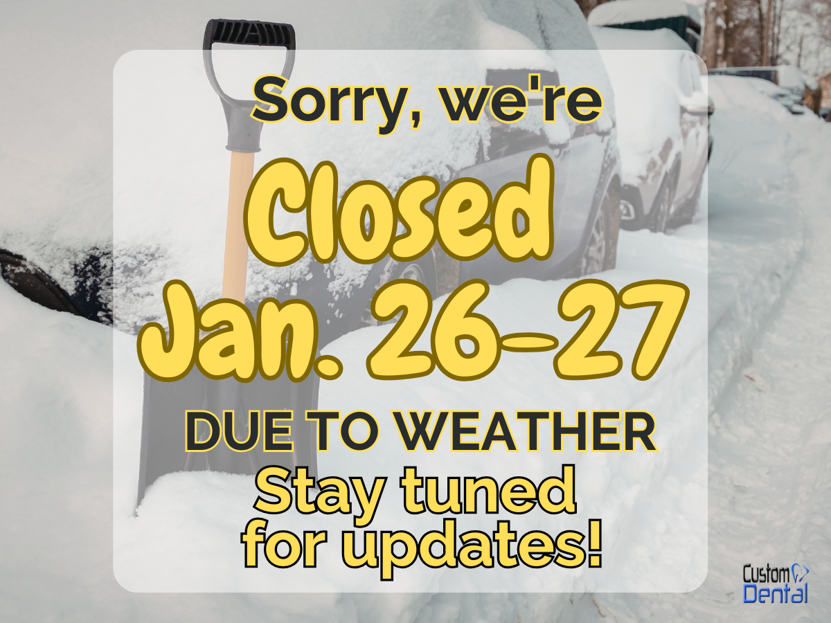 Due to the inclement weather, our office will be closed on January 26 & 27. Be sure to follow us to see daily updates on when we will reopen. If you have a scheduled appointment for Jan. 26 or 27, we'll reach out to reschedule (if we haven't already).